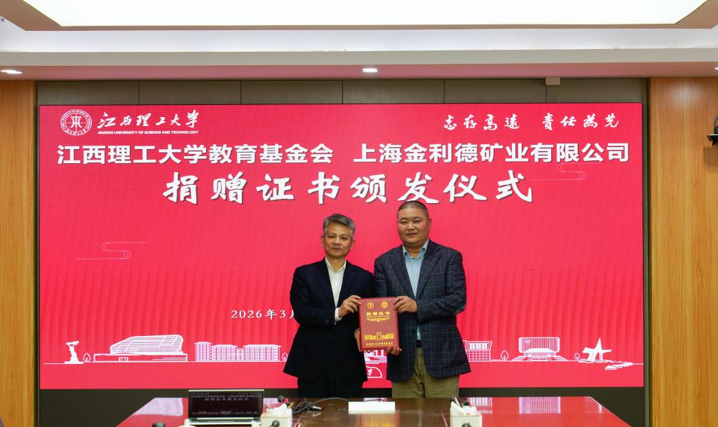 许洪胤与汪金良分别代表江西理工大学教育基金会和上海金利德矿业有限公司签署捐赠协议,董冰岩为上海金利德矿业有限公司颁发捐赠证书。