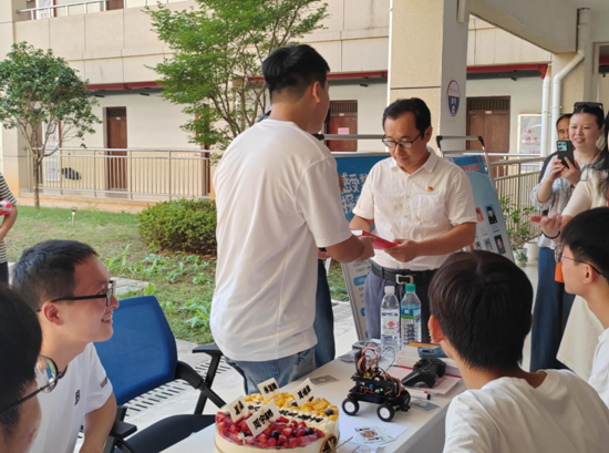 活动现场的生日歌响起,江西理工大学理学院部分领导和辅导员为四名新生送上了生日蛋糕及生日祝福。学院党委书记闫光礼为新生送上书籍《习近平与大学生朋友们》。闫光礼认为这本书是青年大学生前行道路上的一盏明灯,希望同学们肩负时代责任,高扬理想风帆,将小我融入大我,做到有理想、有追求,有担当、有作为,有品质、有修养,让青春为中国式现代化建设挺膺担当!