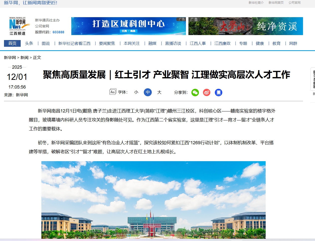 新华网南昌12月1日电(戴艳 唐子兰)走进江西理工大学(简称“江理”)赣州三江校区,科创核心区——赣南实验室的楼宇格外醒目,玻璃幕墙内科研人员专注攻关的身影随处可见。作为江西第二个省实验室,这里是江理“引才—育才—留才”全链条人才工作的重要载体。