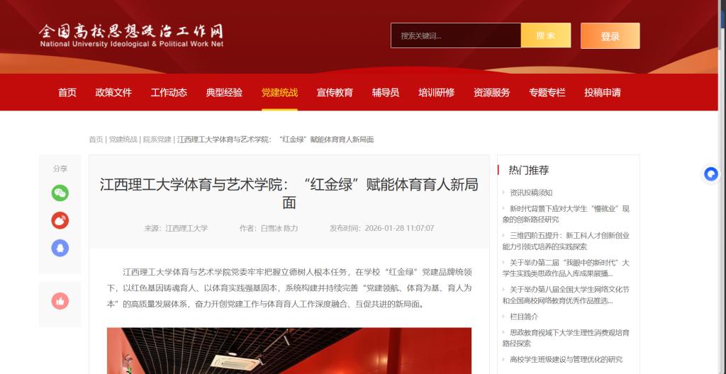 江西理工大学体育与艺术学院党委牢牢把握立德树人根本任务,在学校“红金绿”党建品牌统领下,以红色基因铸魂育人、以体育实践强基固本,系统构建并持续完善“党建领航、体育为基、育人为本”的高质量发展体系,奋力开创党建工作与体育育人工作深度融合、互促共进的新局面。