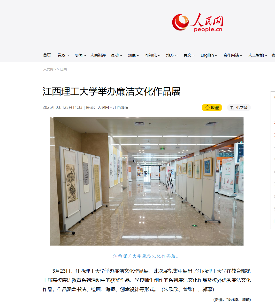 3月23日,江西理工大学举办廉洁文化作品展。此次展览集中展出了江西理工大学在教育部第十届高校廉洁教育系列活动中的获奖作品、学校师生创作的系列廉洁文化作品及校外优秀廉洁文化作品,作品涵盖书法、绘画、海报、创意设计等形式。(朱欣欣、曾张仁、郭璟)