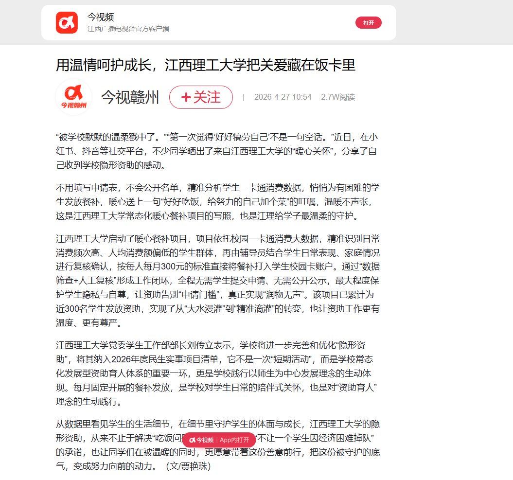 从数据里看见学生的生活细节,在细节里守护学生的体面与成长,江西理工大学的隐形资助,从来不止于解决“吃饭问题”,更传递着学校“不让一个学生因经济困难掉队”的承诺,也让同学们在被温暖的同时,更愿意带着这份善意前行,把这份被守护的底气,变成努力向前的动力。(文/贾艳珠)