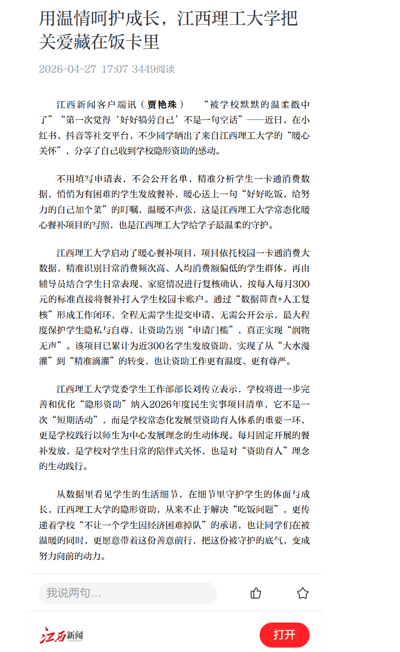 从数据里看见学生的生活细节,在细节里守护学生的体面与成长,江西理工大学的隐形资助,从来不止于解决“吃饭问题”,更传递着学校“不让一个学生因经济困难掉队”的承诺,也让同学们在被温暖的同时,更愿意带着这份善意前行,把这份被守护的底气,变成努力向前的动力。