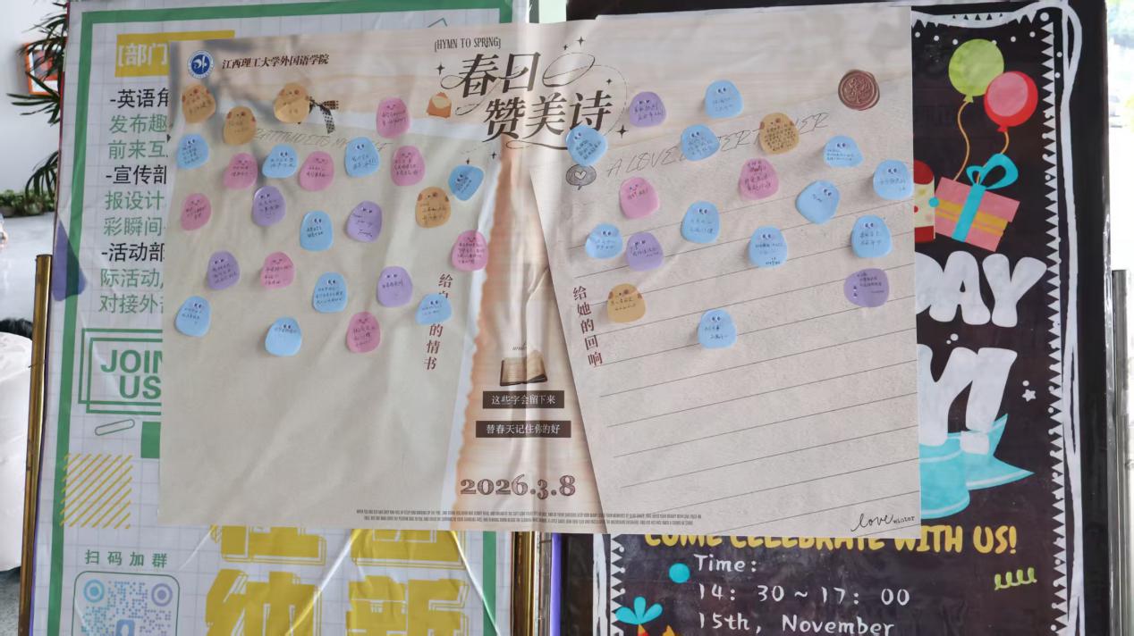 暖心留言墙前人气爆棚,成为同学们传递美好、抒发心声的温情阵地。大家踮脚执笔,在斑斓的便利贴上写下真挚话语,“要永远闪闪发光”“愿我们都被温柔以待”,一句句暖心期许温情满满;也有同学将对学院的致谢凝于笔尖,字字句句皆是心意。缤纷便签层层叠叠贴满墙面,汇聚成一片涌动着爱意的温暖心海,同学们围站墙边品读彼此的心愿与期许,欢声笑语间,同窗情谊愈发绵长,校园温情也在字里行间静静流淌。