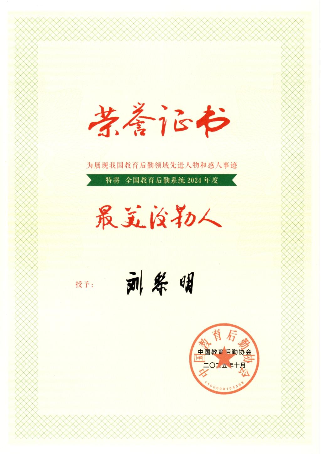 本网讯 10月16日,中国教育后勤协会第三次会员代表大会在北京召开,会上表彰了“2024年度最美后勤人”。我校学生工作部刘黎明教师荣获该项荣誉。本次表彰全国高校仅60人、全省仅2人获此殊荣。