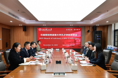 本网讯 11月12日,巴基斯坦旁遮普大学孔子学院外方理事访华团一行来访,并于三江校区濂溪楼召开旁遮普大学孔子学院2025年度理事会。校党委常委、副校长熊志华会见了巴方代表团一行。校计划财务处处长周俊峰,旁遮普大学孔子学院外方院长索比亚·胡拉姆、教务处长艾哈迈德·伊斯兰、财务处长塔斯尼姆·卡姆兰,以及两校国际交流与合作部门相关工作人员参会。会议由校国际交流与合作中心主任、孔子学院中方院长蔡进宝主持。