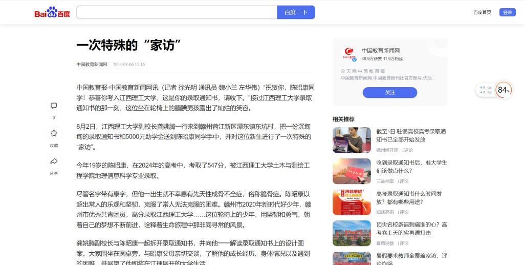 中国教育报-中国教育新闻网讯(记者 徐光明 通讯员 魏小兰 左华伟)“祝贺你,陈昭康同学!恭喜你考入江西理工大学,这是你的录取通知书,请收下。”接过江西理工大学录取通知书的那一刻,这位坐在轮椅上的腼腆男孩露出了灿烂的笑容。