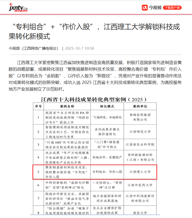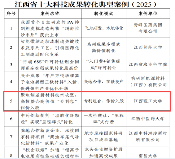 江西理工大学紧密聚焦江西省加快推进制造业高质量发展、积极打造国家级先进制造业集群的战略部署,成果转化项目“聚焦铜基新材料技术攻坚,高校整合高价值‘专利包’作价入股”以专利组合为“金钥匙”、以作价入股为“新路径”,凭借对产业升级的显著推动作用及对成果转化模式的创新突破,成功入选 2025 江西省十大科技成果转化典型案例,为高校服务地方产业发展树立了示范标杆。