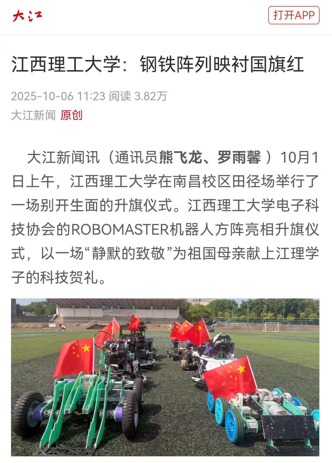 “虽然此次机器人没有动态表演,但让它们与我们一起参加此次升旗仪式,本身就是一种致敬。”江西理工大学电子科技协会成员、2023级学生廖涛表示,“这些机器人是我们亲手完成编程和调试的,它们承载着我们的汗水和对未来的憧憬。在这个特殊的日子,让它们一同见证国旗升起,就是想告诉所有人,在建设科技强国的道路上,我们青年科技爱好者将继续书写精彩的青春篇章!”