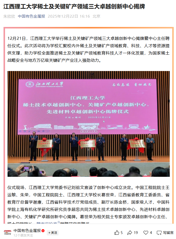 12月21日,江西理工大学举行稀土及关键矿产领域三大卓越创新中心揭牌暨中心主任聘任仪式。此次活动将为学校汇聚校内外稀土及关键矿产领域教育、科技、人才等资源提供支撑,助力学校全面推进稀土及关键矿产领域教育科技人才一体化发展,为国家稀土战略安全与地方万亿级关键矿产产业注入强劲动力。