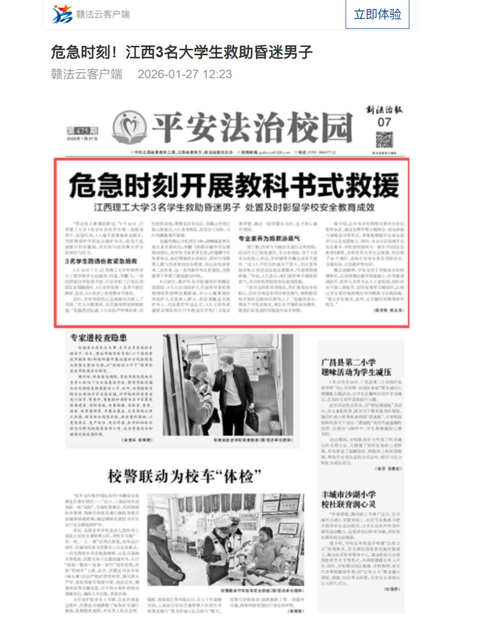 下一条:《新法治报》:危急时刻开展教科书式救援 江西理工大学3名学生救助昏迷男子处置及时彰显学校安全教育成效