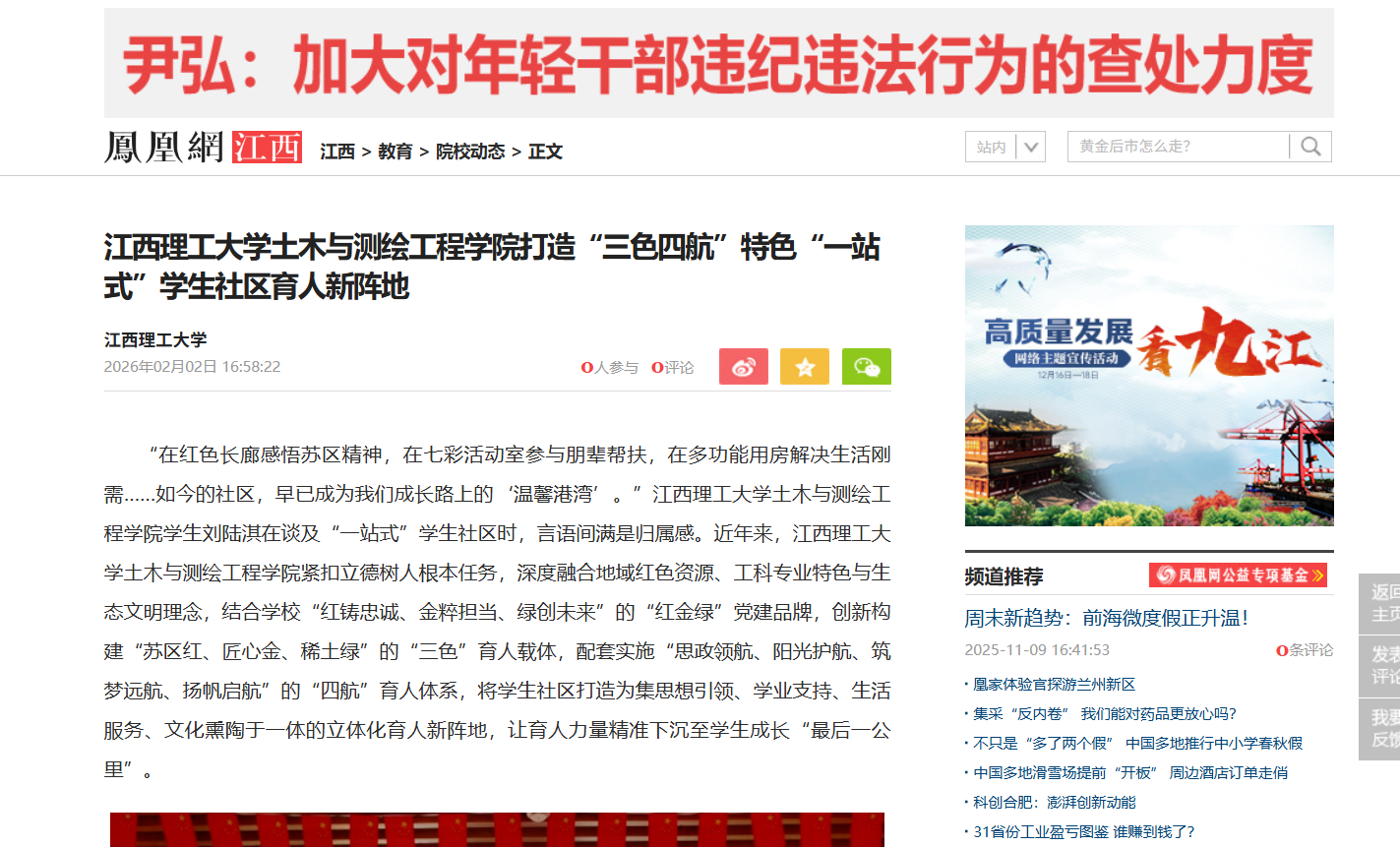 “在红色长廊感悟苏区精神,在七彩活动室参与朋辈帮扶,在多功能用房解决生活刚需……如今的社区,早已成为我们成长路上的‘温馨港湾’。”江西理工大学土木与测绘工程学院学生刘陆淇在谈及“一站式”学生社区时,言语间满是归属感。近年来,江西理工大学土木与测绘工程学院紧扣立德树人根本任务,深度融合地域红色资源、工科专业特色与生态文明理念,结合学校“红铸忠诚、金粹担当、绿创未来”的“红金绿”党建品牌,创新构建“苏区红、匠心金、稀土绿”的“三色”育人载体,配套实施“思政领航、阳光护航、筑梦远航、扬帆启航”的“四航”育人体系,将学生社区打造为集思想引领、学业支持、生活服务、文化熏陶于一体的立体化育人新阵地,让育人力量精准下沉至学生成长“最后一公里”。