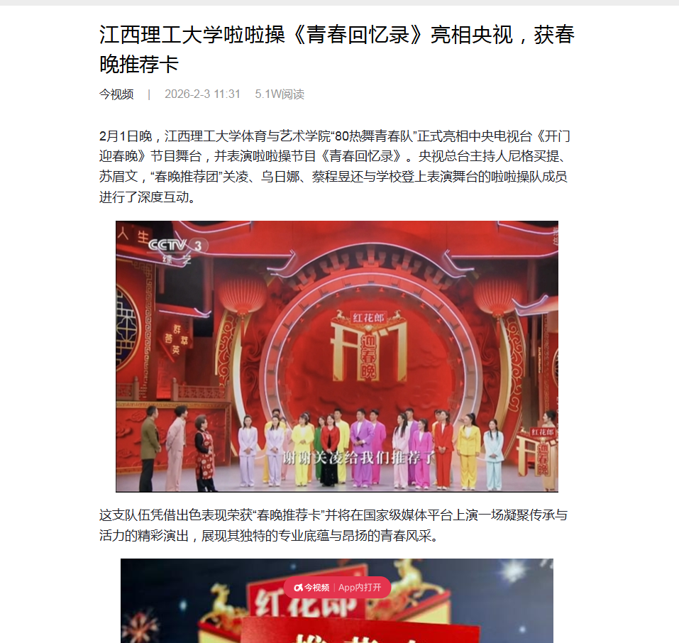 2月1日晚,江西理工大学体育与艺术学院“80热舞青春队”正式亮相中央电视台《开门迎春晚》节目舞台,并表演啦啦操节目《青春回忆录》。央视总台主持人尼格买提、苏眉文,“春晚推荐团”关凌、乌日娜、蔡程昱还与学校登上表演舞台的啦啦操队成员进行了深度互动。