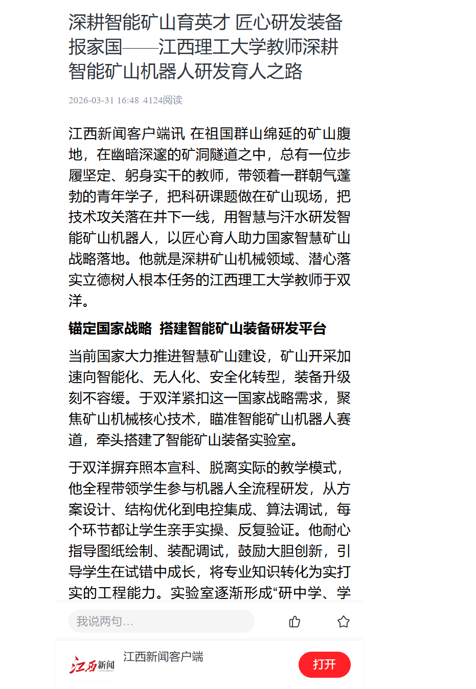 【江西新闻客户端】:深耕智能矿山育英才 匠心研发装备报家国——江西理工大学教师深耕智能矿山机器人研发育人之路