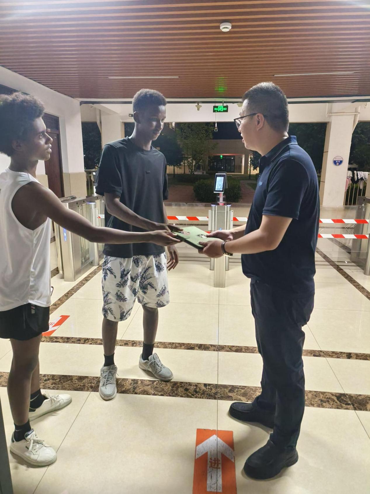 9月18日晚21点许,我校经济与管理学院2024级工商管理专业两名乍得籍国际学生——叶海亚和莫·阿里,在三江校区(东园)体育馆附近使用共享单车时,发现车筐内有一部遗失的iPad。两人商议后,在第一时间将设备交给了学校老师,并主动说明了情况。在国际教育学院和学工部多名领导和老师的协同调度下,关于iPad的失物信息通过辅导员在各学院班级群迅速扩散。当晚22点30分左右,iPad便顺利归还至失主手中。
